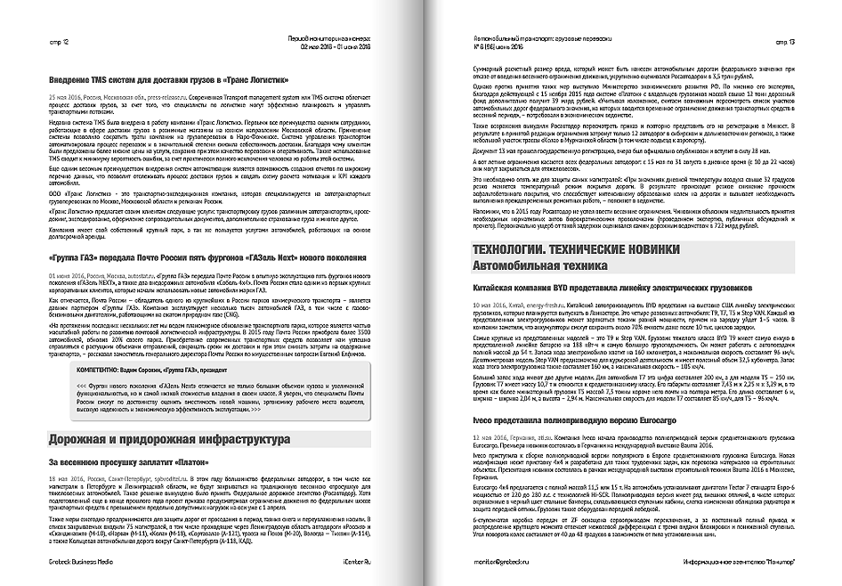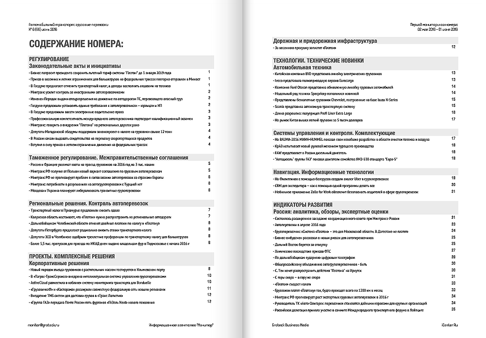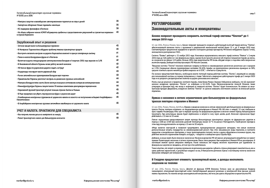 Ежемесячный бюллетень представляет большие обзоры законодательных актов, влияющих на работу транспортных подразделений. Кроме того, в каждом выпуске отраслевые новинки, обзоры, аналитические материалы, рейтинги, тренды, мнения экспертов по различным аспектам грузовых автомобильных перевозок