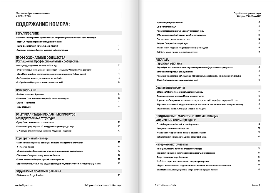 Реклама: «наружка», социальные проекты. Продвижение и коммуникации. Фирменный стиль и ребрендинг. Интернет-инструменты, технологии рекламы и PR. Лица рекламных кампаний. Тенденции и новости блогосферы. Проблемы и конфликты