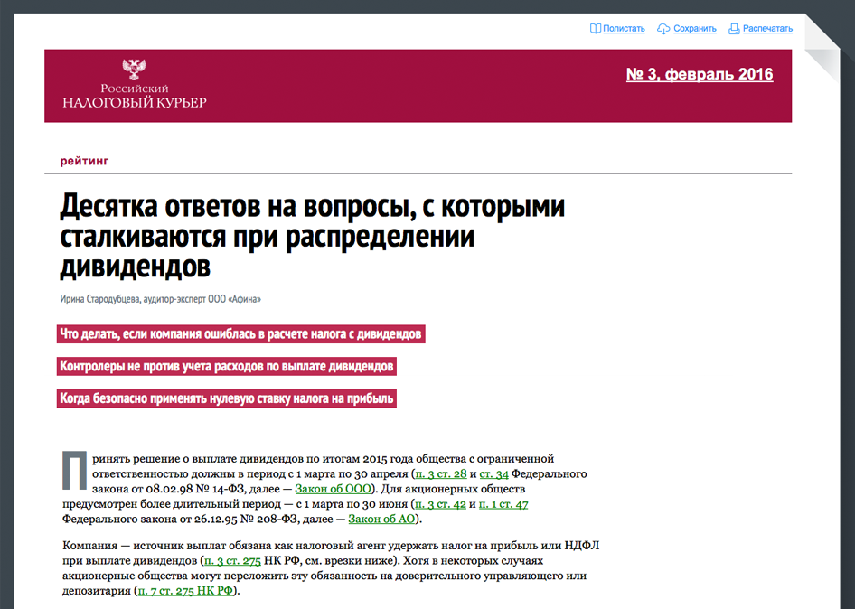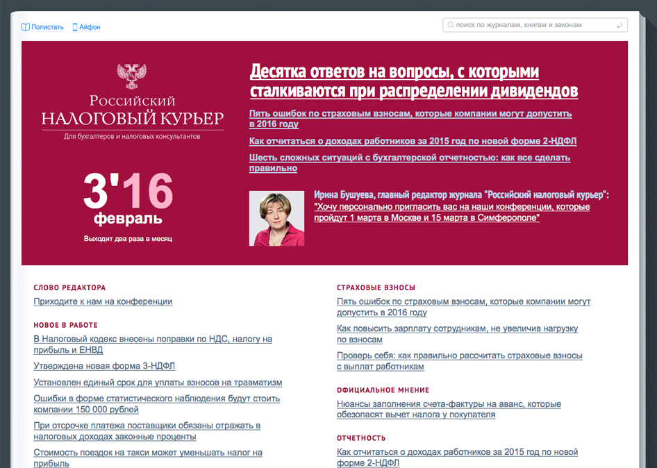 С журналом «Российский налоговый курьер» каждая компания – в безопасности от налоговых правонарушений. Журнал посвящен тому, как правильно платить налоги и вести учет. Никаких сомнительных схем и рискованных операций в нем нет. Только проверенные рекомендации. Авторами многих статей выступают представители ФНС России, а также Минфина России. Информация по любому вопросу дана с учетом всех мнений: представителей госструктур, судов, сторонних консультантов.