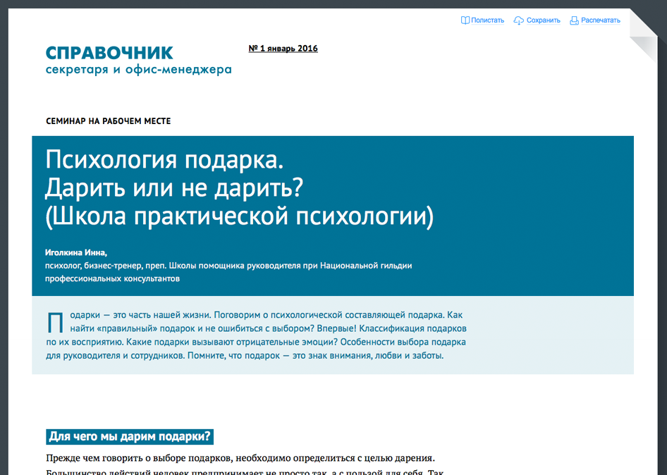 Практика работы с входящими, исходящими и внутренними документами, примеры их составления и оформления, а также деловой протокол и этикет, психология взаимоотношений на рабочем месте, юридические консультации по трудовому праву и многое другое.