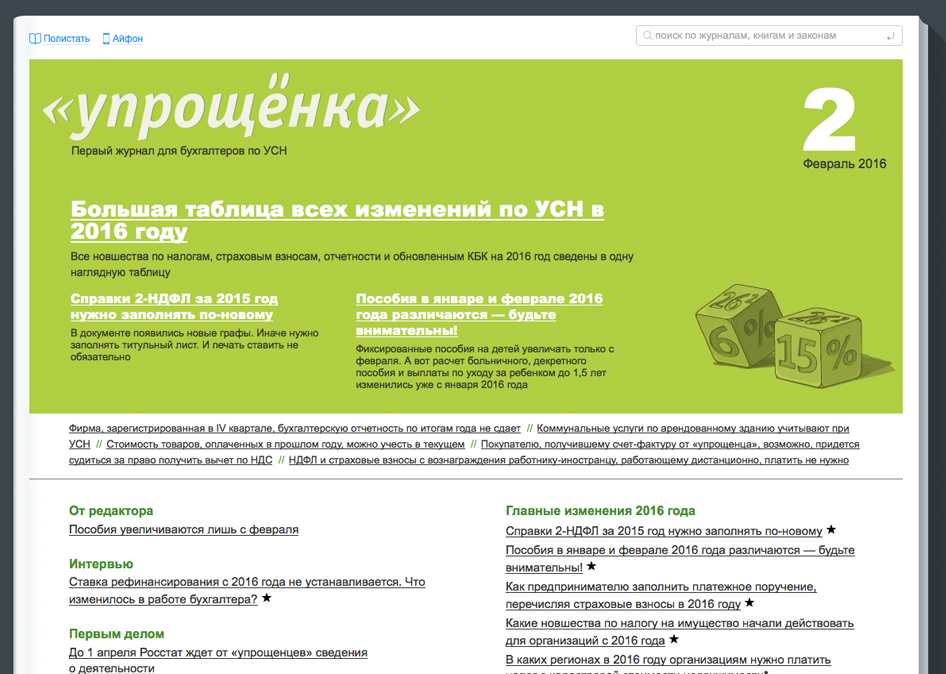 Это всегда оперативная и четкая подача материала, который невозможно найти в других источниках. Информация проверяется представителями государственных органов - Минфина, Минтруда и ФНС, и можно на 100% быть уверенным в ее достоверности. Поэтому журнал любят и главные бухгалтеры, и бухгалтеры по расчету зарплаты, и индивидуальные предприниматели, и руководители компаний на УСН.