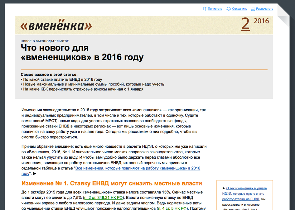 Журнал «Вмененка» — это горячие новости и Минфина, ФНС и региональных налоговых служб, статьи и арбитражная практика по вопросам применения ЕНВД, детальное описание специфики расчета и уплаты ЕНВД для каждого региона в соответствии с действующим местным законодательством.