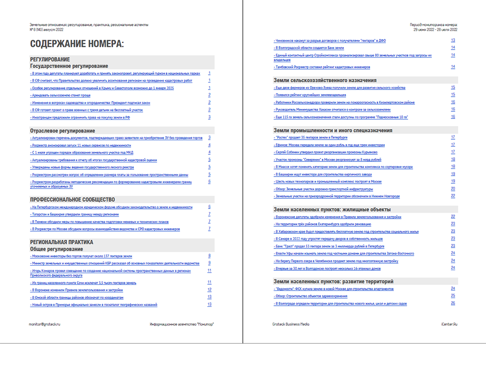 Земельные отношения - совокупность отношений, возникающих между субъектами земельного права по поводу владения, пользования и распоряжения землей. Это проблема сложная и многоаспектная, включающая большой круг вопросов: формы собственности и хозяйствования, рынок и цена земли, рента, залог, налог на землю, землеустройство, государственное регулирование, управление земельными ресурсами. Земля рассматривается в качестве объекта земельных правоотношений (как разновидности общественных отношений) не из-за того, что она – объект природы, составная часть окружающей среды, а вследствие экономической выгоды от ее использования человеком. Это важное обстоятельство определяет экономическое, социальное и экологическое значение земельных отношений. Тем не менее, земля как объект общественных отношений продолжает оставаться объектом природы даже тогда, когда к ней прикладывается человеческий труд. В этом одна из основных особенностей земли в качестве объекта общественных отношений и соответственно самих земельных отношений. Информационный бюллетень «Земельные отношения: регулирование, практика, региональные аспекты» представляет вниманию читателей ежемесячный мониторинг главных событий по вопросам земельных отношений и земельного права. На страницах издания читатели найдут главные отраслевые новости, изменения в государственном регулировании, региональную практику решения земельных вопросов, обзоры, аналитические материалы, тенденции и прогнозы развития рынка, экспертные мнения.